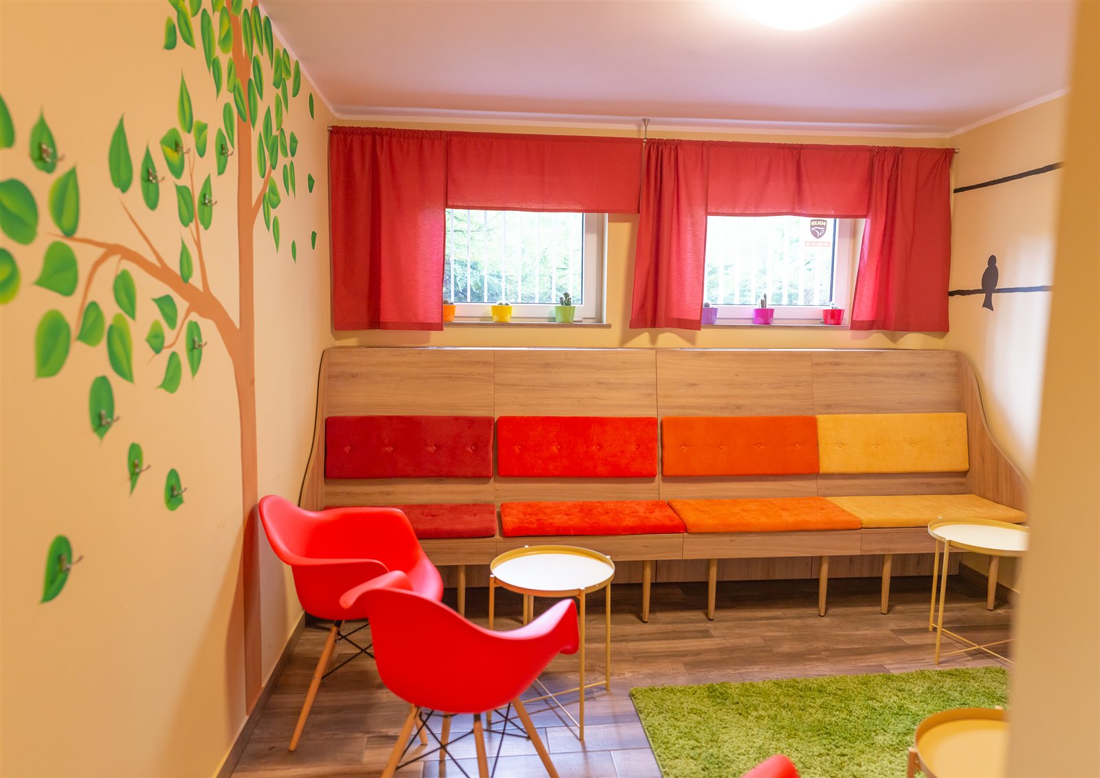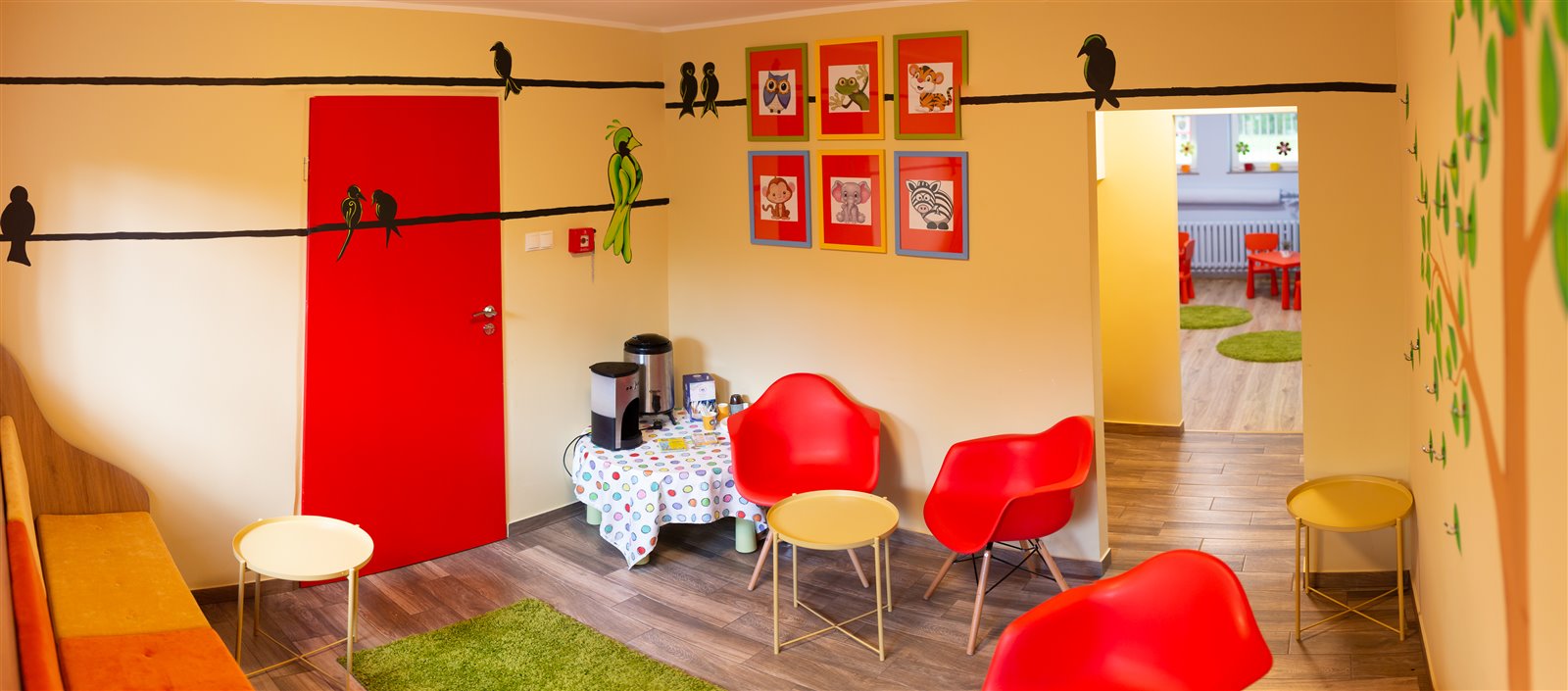 3. Przedsionek pełniący funkcję szatni i poczekalni dla rodziców (zmieszczą się tam również wózki) - wyposażony m.in. w tapicerowaną ławkę przygotowaną na wymiar, blat, fotele i stoliczki.