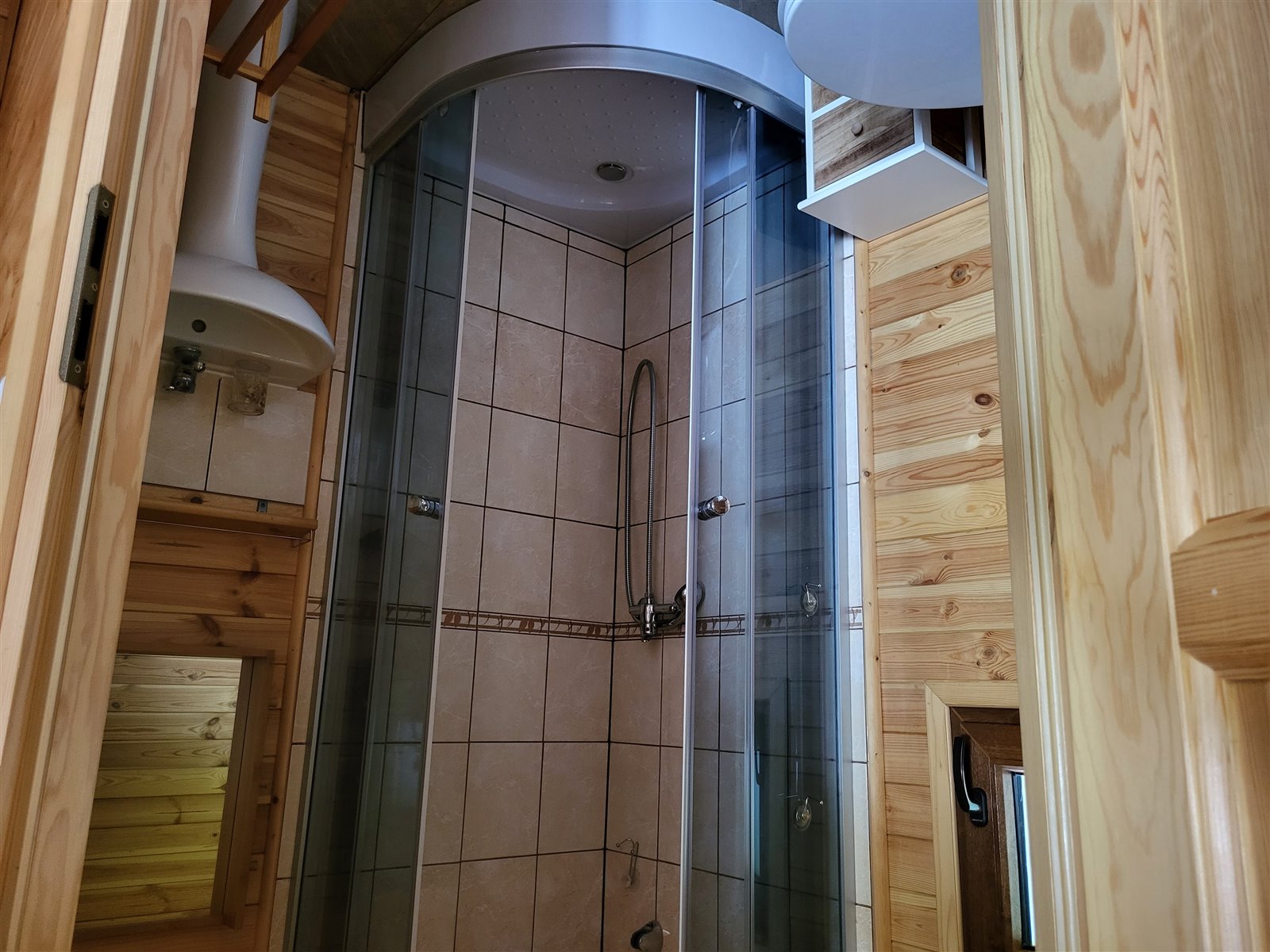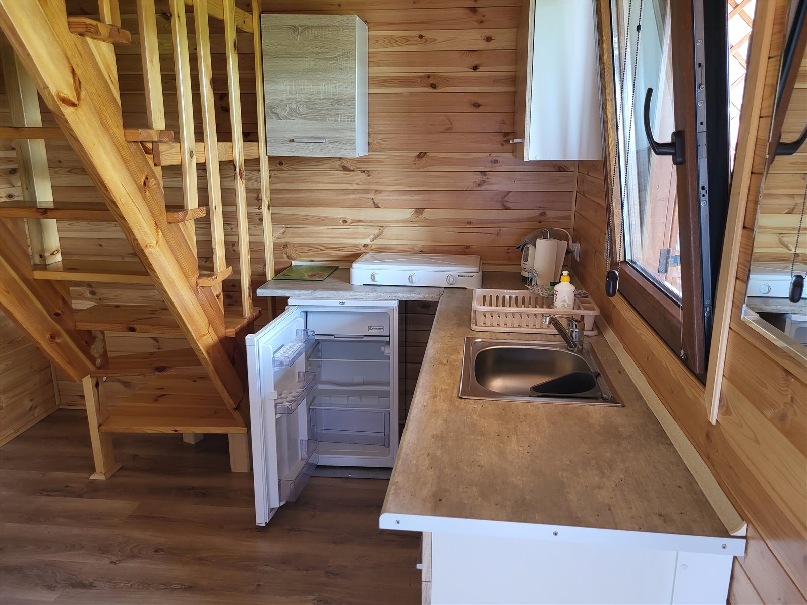 • parter: salon (tapczan rozkładany, szafa, ława, TV), aneks kuchenny (lodówka, czajnik, naczynia, garnki), łazienka (prysznic, WC, umywalka),