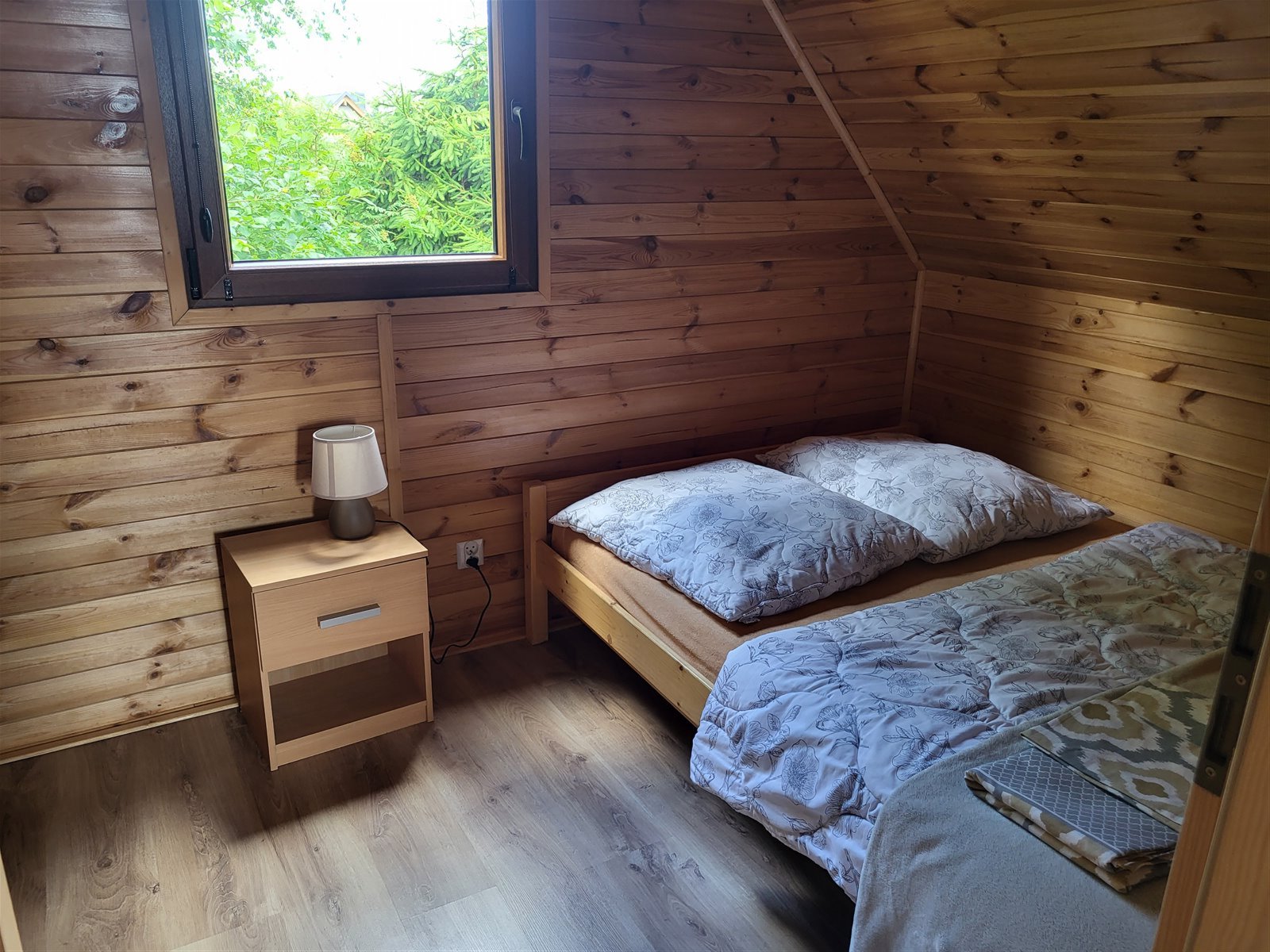 • piętro: dwie sypialnie zamykane (jedna z trzema łóżkami pojedynczymi, druga z łożem małżeńskim),