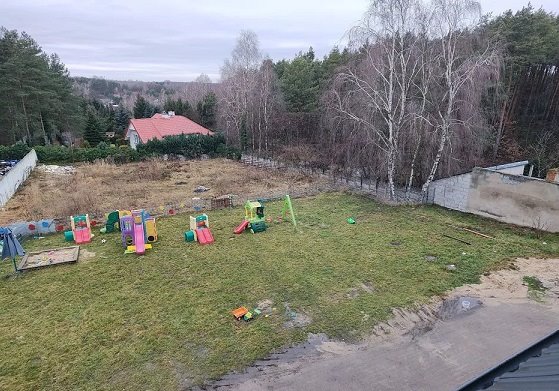 Powierzchnia działki: 2469 m2, szeregowiec. Każda z trzech kondygnacji ma ok. 100 m2. W tej chwili na pierwszej kondygnacji w suterenie zorganizowana jest kuchnia cateringowa, na drugiej kondygnacji ( parter od strony wjazdu ) zarejestrowany żłobek, na kolejnej przedszkole.