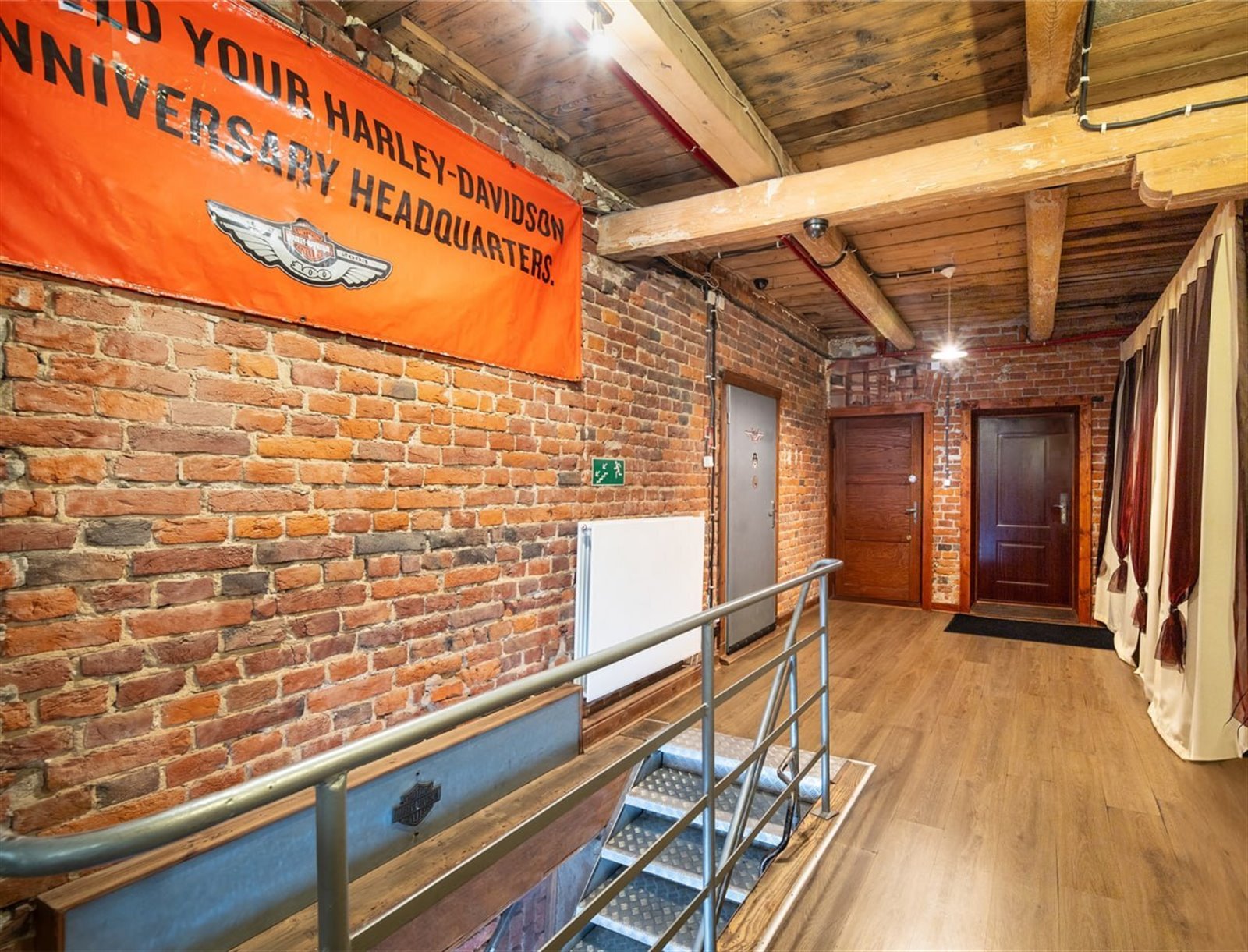 Przestrzeń niemieszkalna aktualnie wykorzystywana jest jako salon i serwis motocykli oraz magazyny części. Wysokość pomieszczeń oraz możliwość zlikwidowania stropu pomiędzy pomieszczeniami, stwarza duży potencjał wykorzystania przestrzeni w różnych konfiguracjach.
